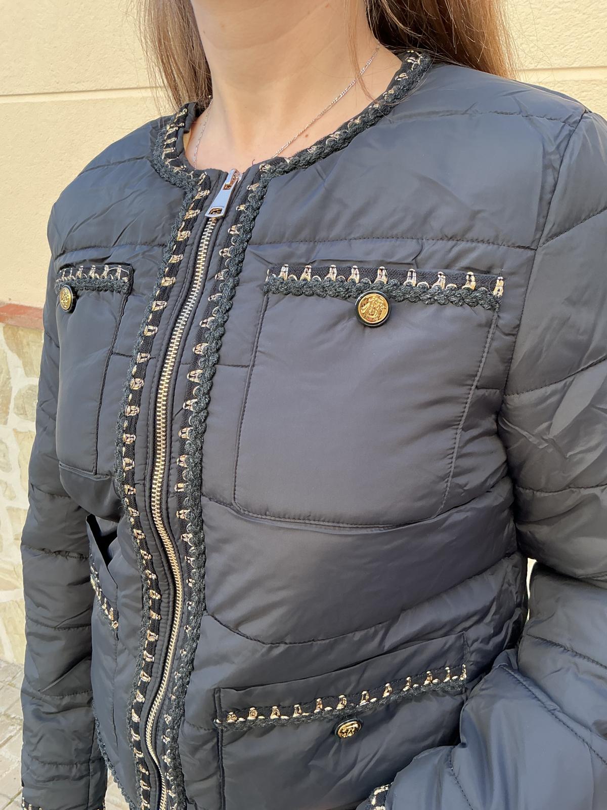 Chaqueta acolchada tipo Chanel. Chaqueta acolchada corta, con cuello redondo, y cierre de cremallera. Presenta 4 bolsillos delanteros con botón de adorno y al filo de todas las costuras presenta un trenzado de hilo dorado.