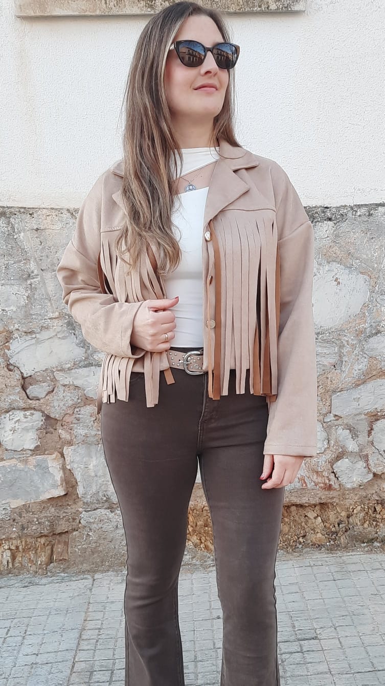 Chaqueta de ante con flecos. Chaqueta con cuello solapa, con hombro caído. Presenta flecos largos en la parte del pecho y la espalda, que le dan soltura  movimiento a la prenda, son los que la hacen tan especial. Se abrocha con botones dorados.